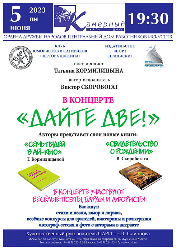Презентация новых книг "Семь пядей в ай-кью" и "Свидетельство о рождении". В концерте участвуют весёлые поэты, барды, афористы. Вас ждут стихи и песни, юмор и лирика, весёлые конкурсы для зрителей, викторины и розыгрыши, автограф-сессия и фото с авторами в антракте. Стоимость: 300-350 руб
